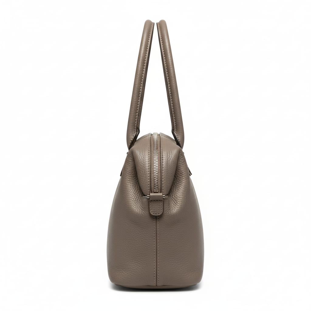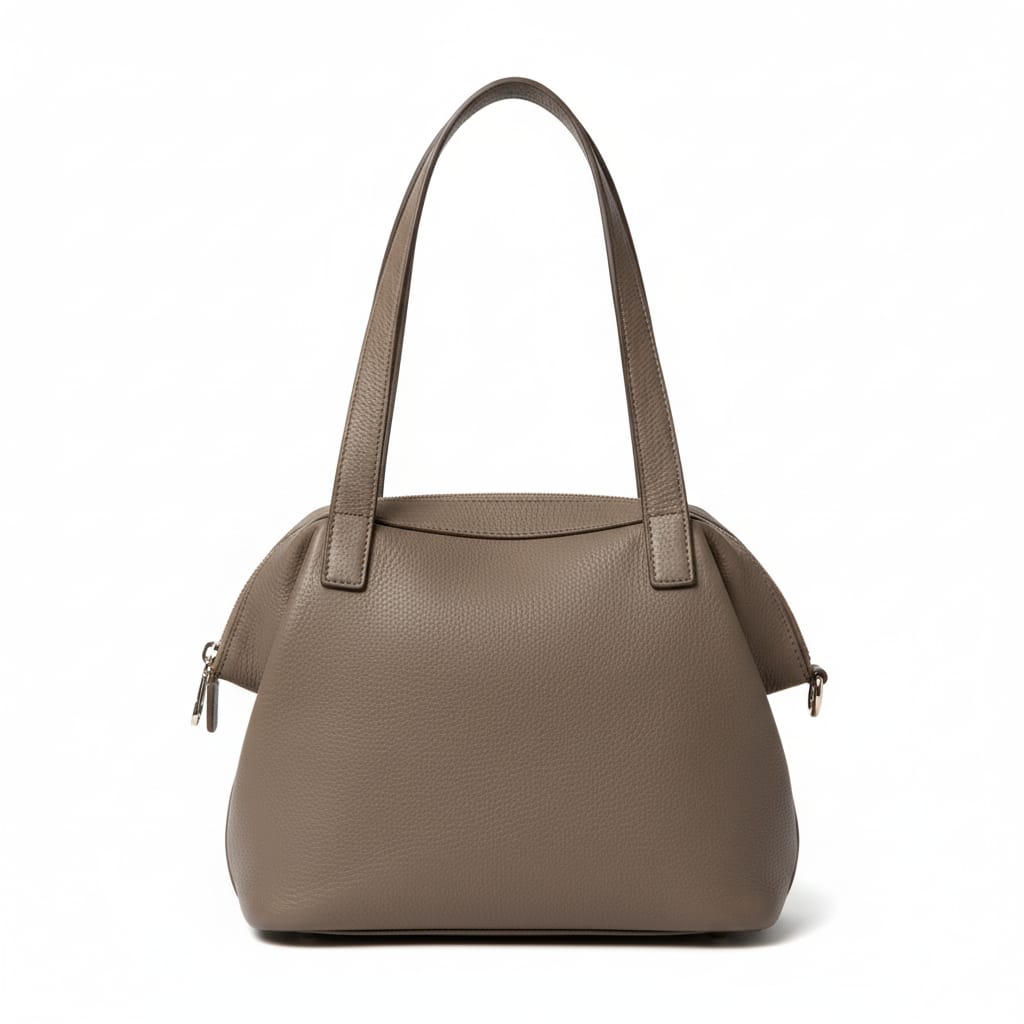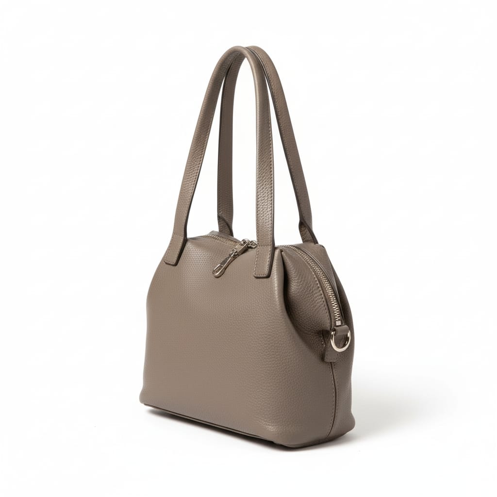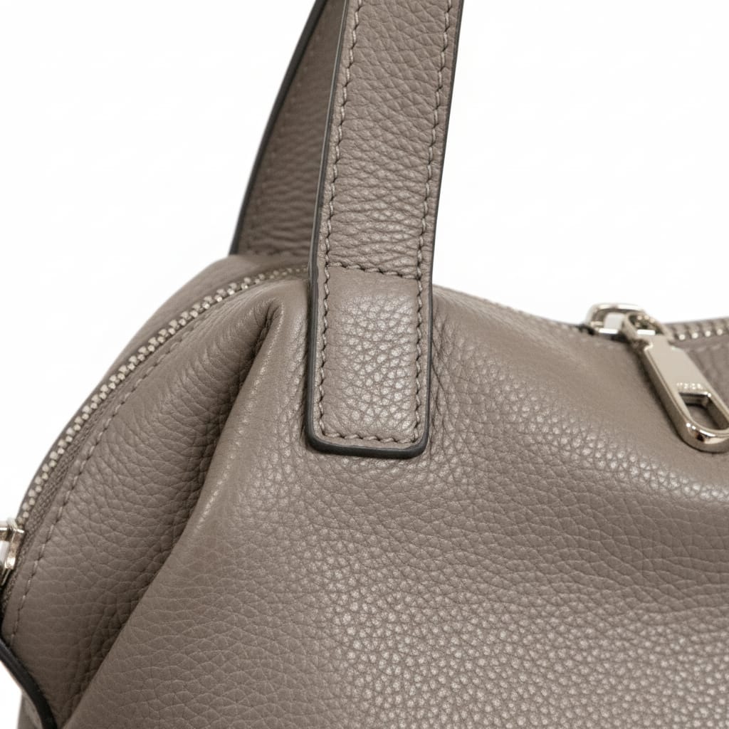 – Materiale: Realizzata in pregiata pelle martellata (pebbled leather) di colore grigio tortora (greige/taupe).
