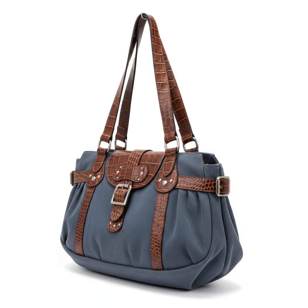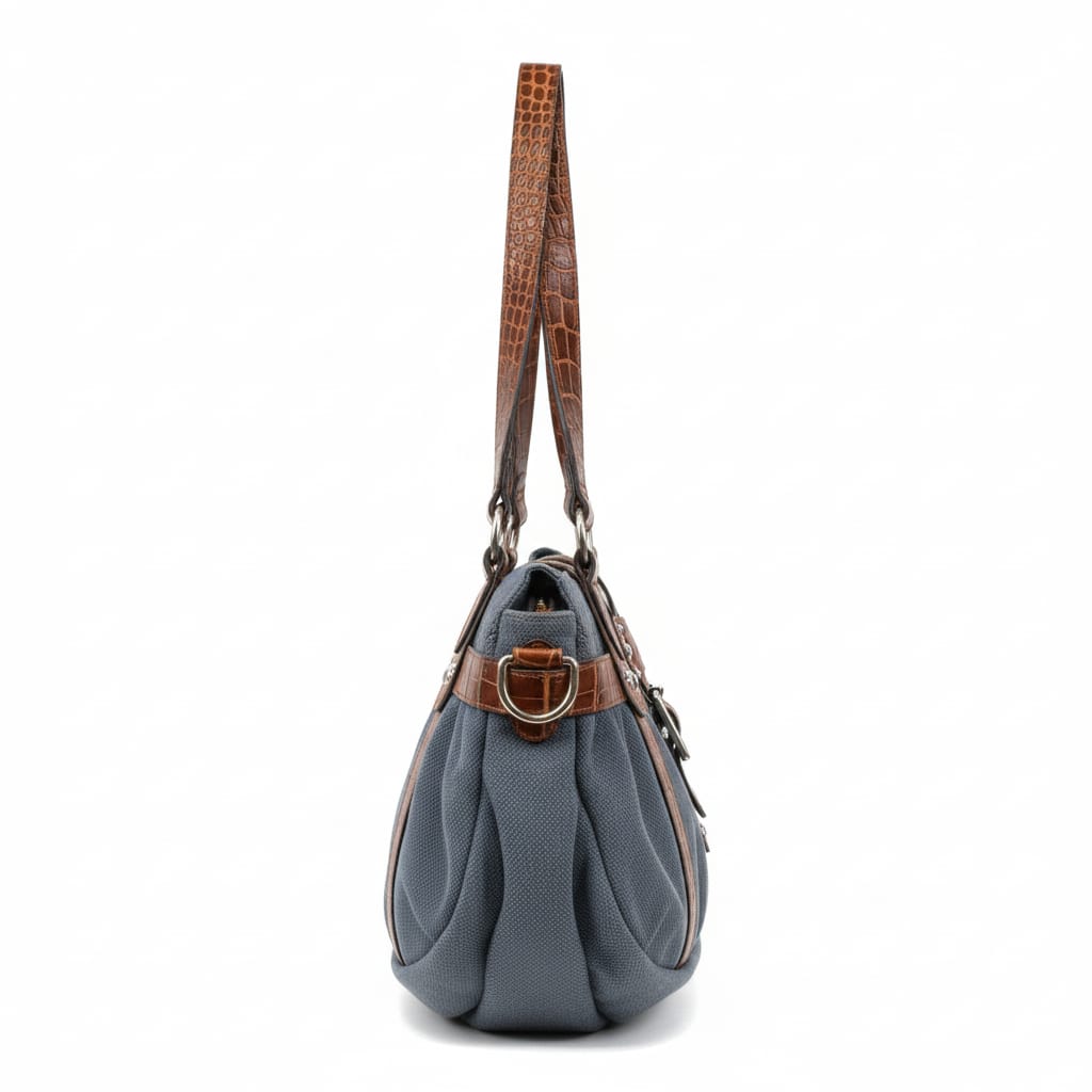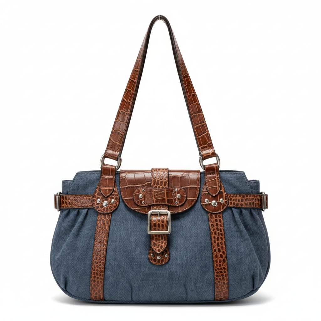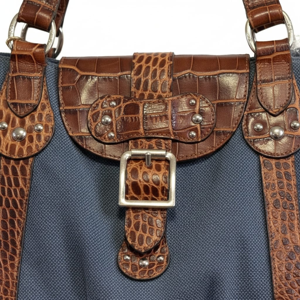 Borsa di design chic con fascia in tela blu e dettagli in pelle di vitello. Ideale per l’uso quotidiano e per occasioni speciali.