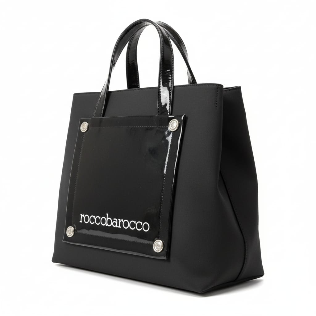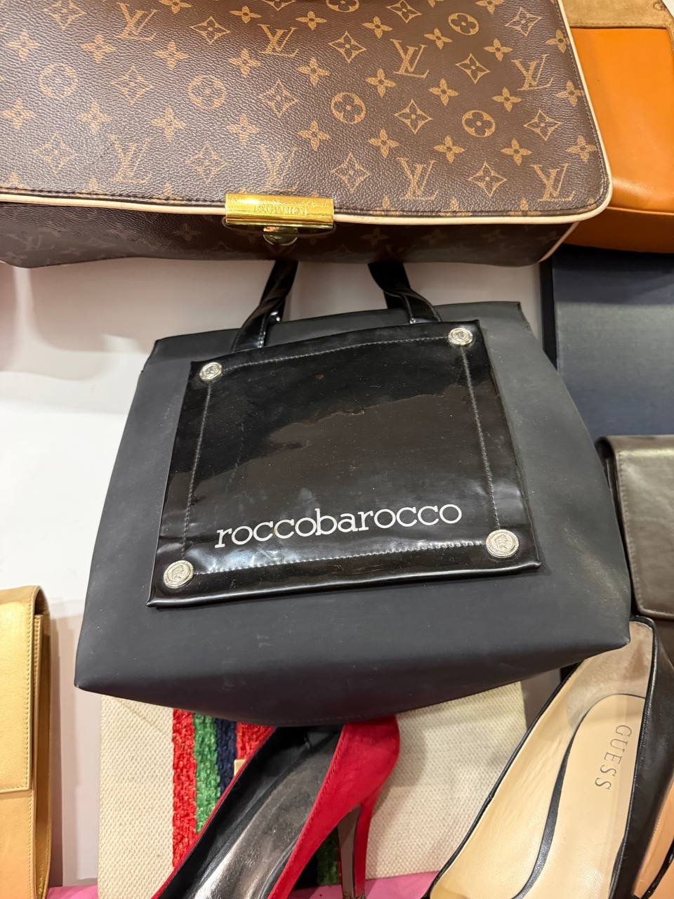 Borsa elegante in tessuto nero con logo Roccobarocco su pannello frontale. Adatta per uso quotidiano e occasioni speciali. Condizioni generali buone, con alcuni segni di usura visibili. Perfetta per chi cerca un accessorio alla moda.