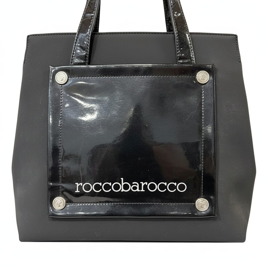 Borsa elegante in tessuto nero con logo Roccobarocco su pannello frontale. Adatta per uso quotidiano e occasioni speciali. Condizioni generali buone, con alcuni segni di usura visibili. Perfetta per c