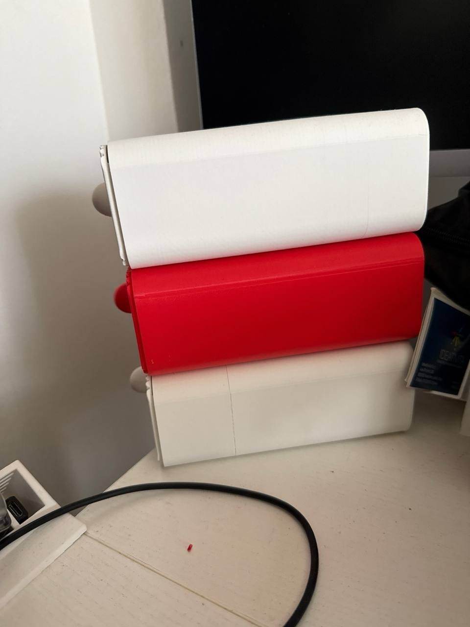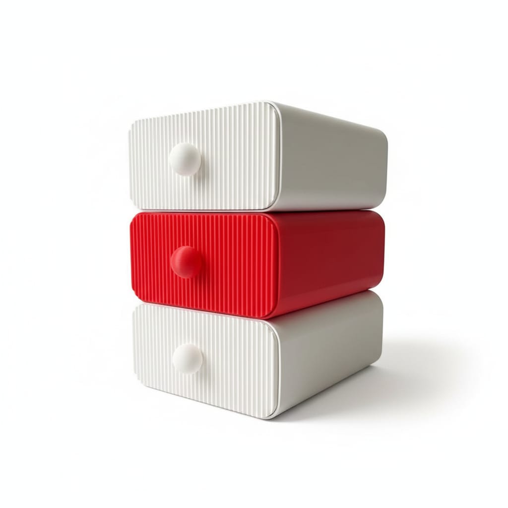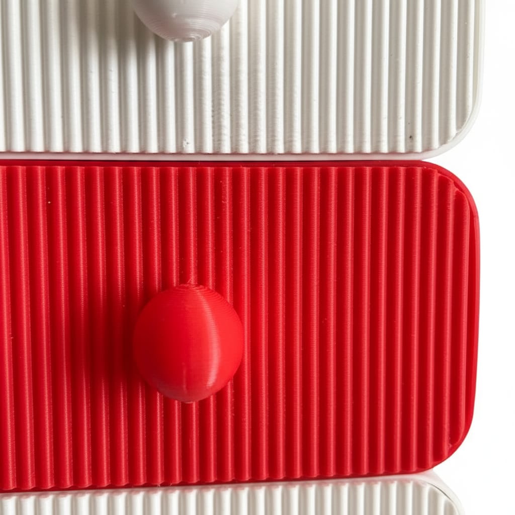 Cassettiera di design moderna, realizzata in stampa 3D, composta da tre cassetti di colori bianco, rosso e nero. Ogni cassetto presenta una manopola rotonda per una facile apertura. Un’aggiunta unica e funzionale per qualsiasi spazio di lavoro o camera.