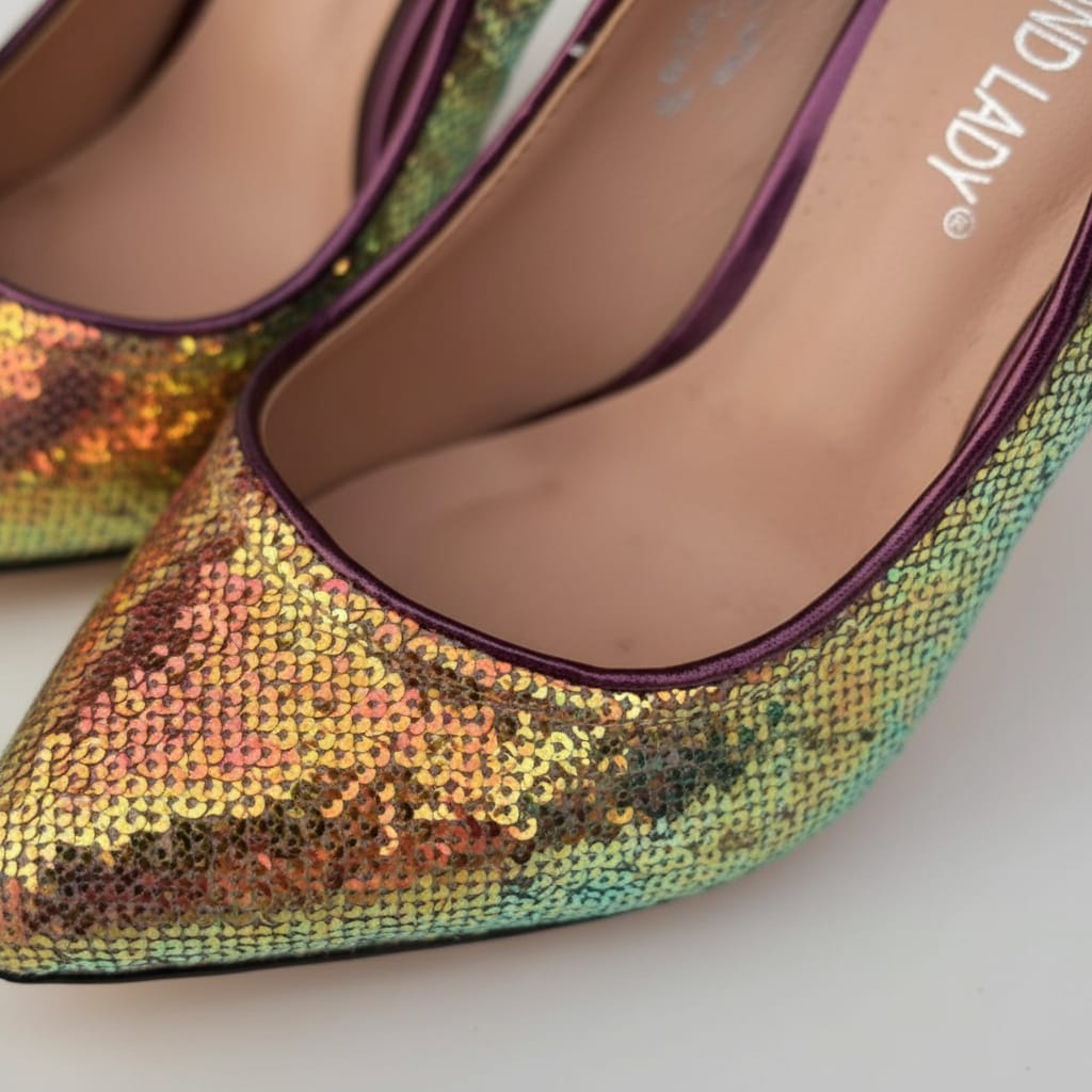 * **Materiale:** Ricoperti di paillettes iridescenti (effetto camaleonte oro/verde/viola) con fodera interna e tacco bordeaux/viola scuro.