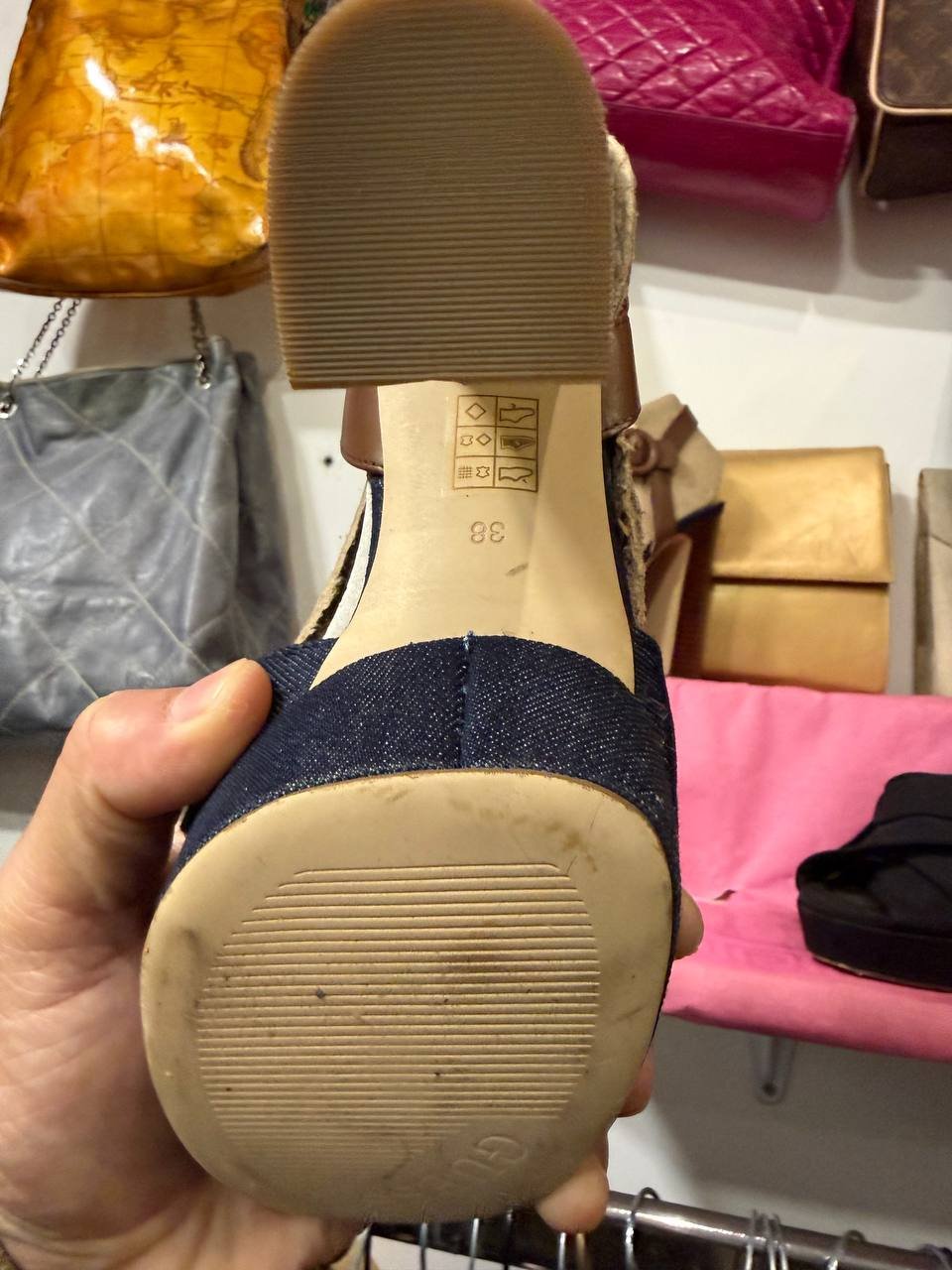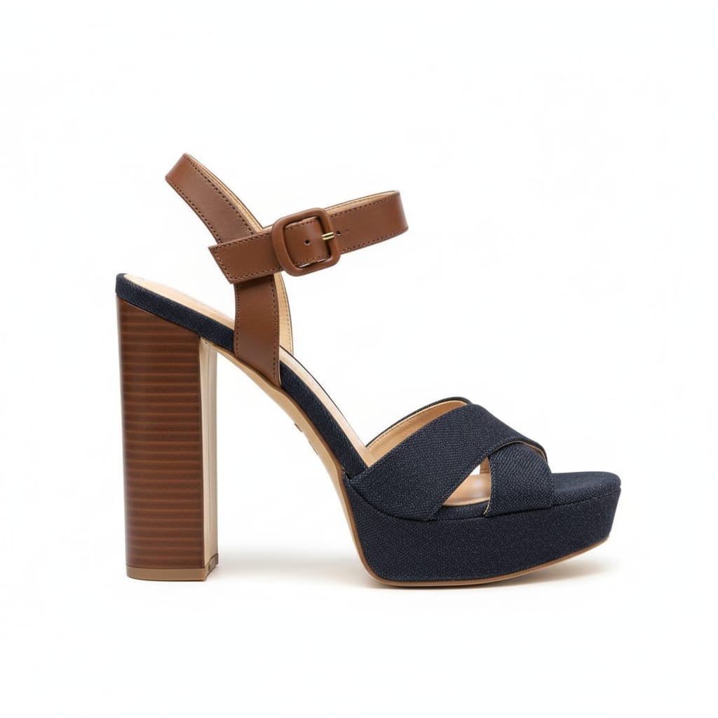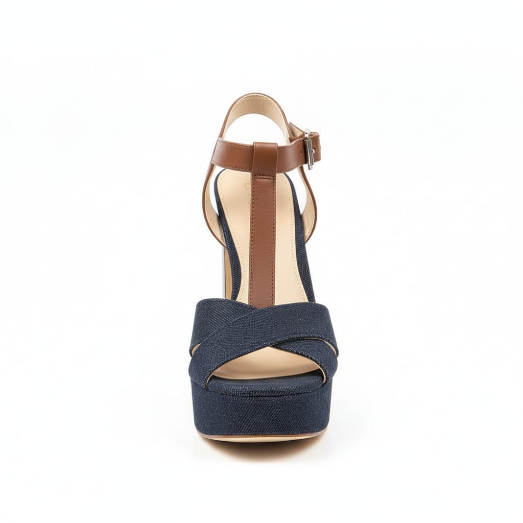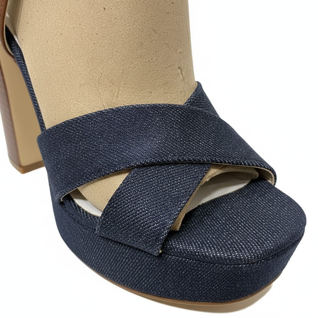 Sandali alti con platform realizzati in denim blu scuro con dettagli in cuoio marrone. Caratteristiche principali:
