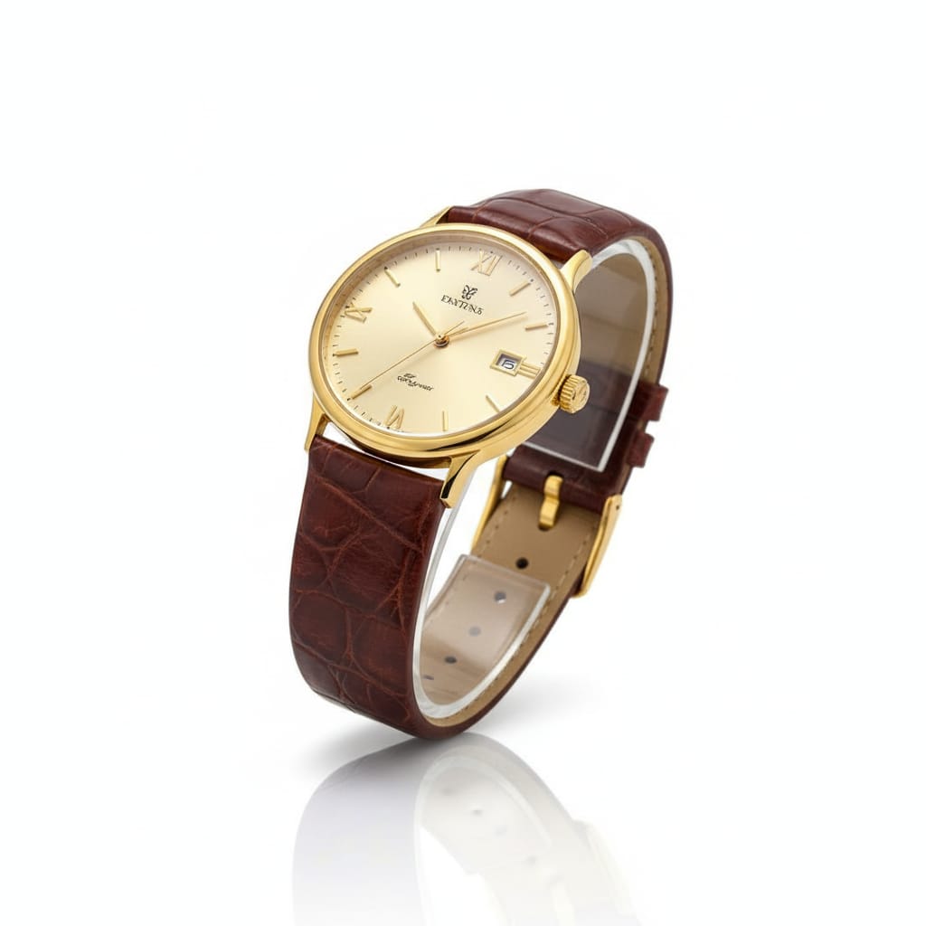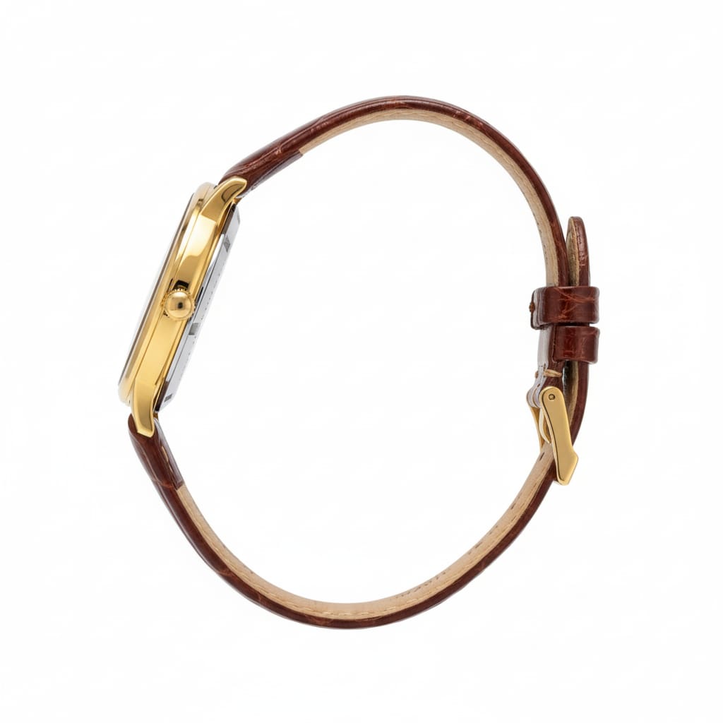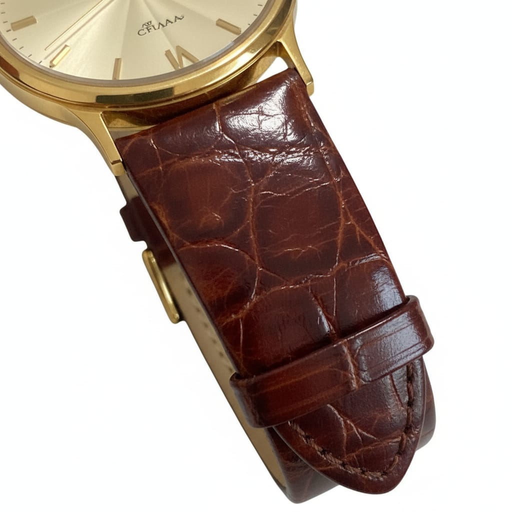 – Cinturino in pelle marrone con motivo coccodrillo.