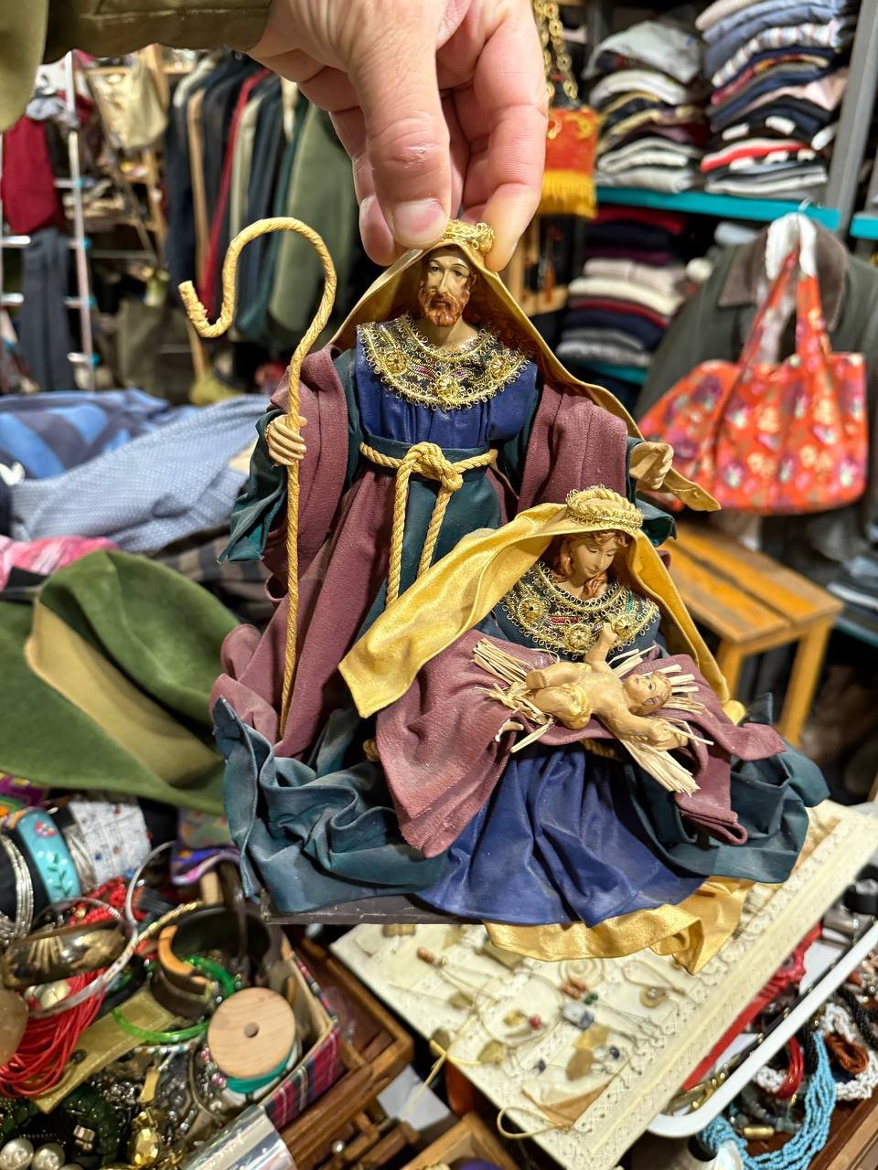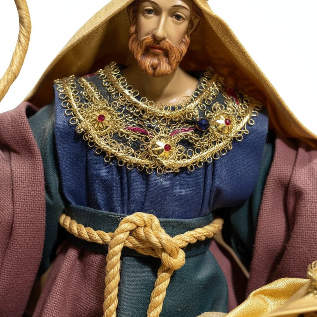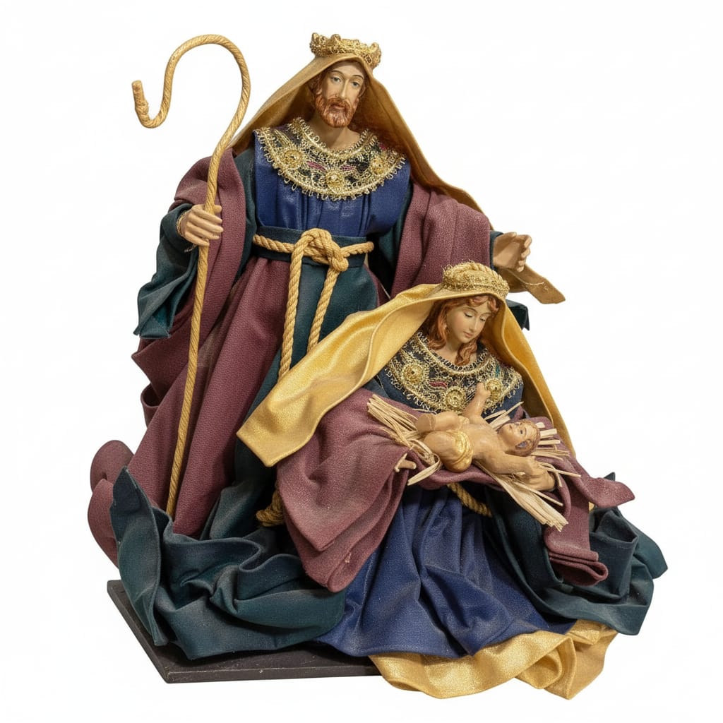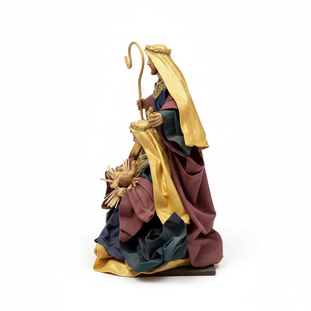 Set di figure sacre per presepe, realizzate con materiali pregiati. Dettagli finemente lavorati e abbigliamento ricco di colori.